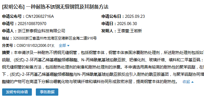 2025年9月23日,浙江新泰鋼業科技有限公司成功申請一項名為“一種耐熱不銹鋼無縫鋼管及其制備方法”專利,申請公布號為CN120682716A,申請日期為2025年6月30日。